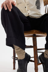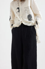 Textured linen pants with a fixed waistband, zip & button fly and belt loops. Discreet pleating at the waistline flows down to a wide leg silhouette with folded cuffs. Two button-up flap pockets are set low at the rear. Fully lined in Aleksandr Manamis' bespoke 'Lectures' cotton fabric.