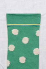 The French brand Bonne Maison creates high quality socks with Egyptian cotton and an elastane double thread. A mid calf length sock featuring a green polka dot design.