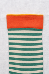 The French brand Bonne Maison creates high quality socks with Egyptian cotton and an elastane double thread. A mid calf length striped sock in white, ming green with tangerine red edge and orange toe.