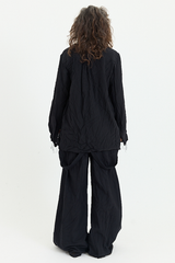 This shirt by Archivio J.M. Ribot is crafted from a beautifully crinkled vintage silk. The shirt features an exaggerated placket with buttons placed sporadically down the entire length of the shirt. The button placement continues onto the front pocket and sleeve hems, an incredible detail particularly considering the hand stitching of each buttonhole, and antique nature of each button. The fit is relaxed, with a wide body and raw hems. This shirt beautifully embodies the label's artisanal sensibilities - a statement piece to keep forever.