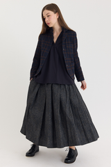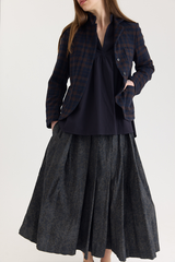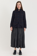 The Caryl Jacket by Bergfabel is crafted from a brown and navy plaid wool, offering a timeless and versatile outer layer. It features a stand collar, single-button cuffs, a five-button front closure, a welted chest pocket, and front patch pockets. Unlined for a lighter feel, the jacket combines classic tailoring with relaxed wearability.