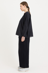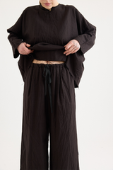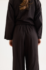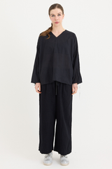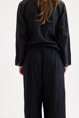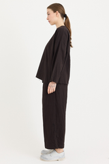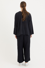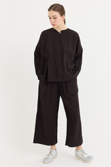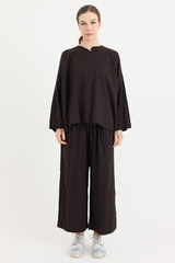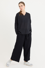 Wide leg pants by Scha, feature an adjustable waist with a tie and elastic, side seam pockets, and a single front pleat on each side. Made from 100% cotton flannel, with the weight of the fabric developing a beautiful shape to it. These are full length trousers in a wide cut, making them the perfect pair for relaxed, yet refined dressing.