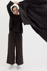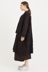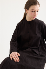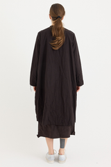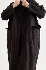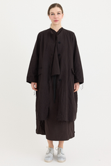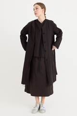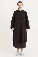A button-down coat by Scha, featuring a rounded neckline and unique fabric buttons. Designed with raw-edge finishing, two front pockets and ribbon trim. Made from 100% cotton flannel, with the weight of the fabric developing a beautiful shape to it. This is a beautifully cozy coat, perfect for layering throughout cooler seasons.