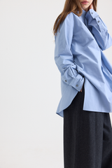 The Baselitz Shirt is cut long in crisp cotton poplin, offering a clean, contemporary silhouette. Designed with a band collar and a half-length button placket, it features set-in sleeves with double button cuffs, side slits, and a gently curved hem. A single box pleat at the back adds ease, while matching pearl buttons finish the look with subtle refinement.