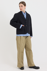 The Cosimo Classic Blazer is tailored from a wool and silk felt in deep charcoal grey. Slightly cropped, it features a notched collar, horn-hued button front, and a clean, unlined finish. Set-in sleeves and a vent at the back lend structure, while patch pockets at the chest and front add a utilitarian ease. A regular fit balances sharpness with wearability.