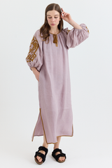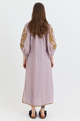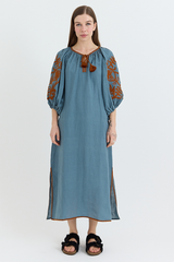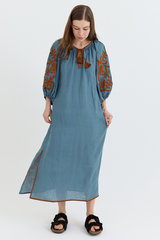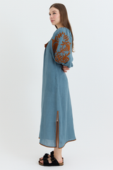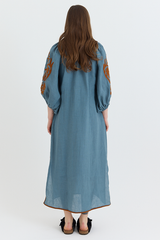 The Corsica Puff Veronica Kaftan is crafted from 100% linen and finished with delicate hand-stitched embroidery, showcasing the brand’s artisanal attention to detail. Designed with exaggerated puff sleeves, a tie belt, and an adjustable neckline, it allows for versatile styling options. The dress has a relaxed, breathable fit, making it perfect for summer evenings or effortlessly throwing on while travelling.