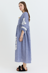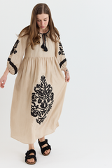 The Geoglific Applique Dress is crafted from 100% linen and finished with delicate hand-stitched embroidery, showcasing the brand’s artisanal attention to detail. Designed with exaggerated puff sleeves, a pleated waist, and an adjustable neckline, it allows for versatile styling options. The dress has a relaxed, breathable fit, making it perfect for summer evenings or effortlessly throwing on while travelling.