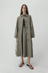 An oversized cocoon-shaped jacket with batwing shaped sleeves. The hem is softly cinched with elastic, creating a modern gathered effect. Large patch pockets with button closures add utility to the design, while the concealed button placket fastens neatly up to the collar. Finished with a rounded peak collar, this super-light piece blends comfort and style effortlessly.