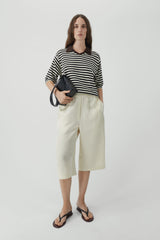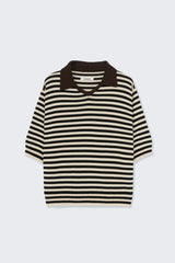 A super-light short-sleeve polo with a relaxed, regular fit. It features a V-neckline with a classic polo collar, detailed in contrasting brown, and is finished with ecru and black stripes for a refined touch. Completed with a ribbed hem at the waist, this piece balances airy elegance with timeless ease.