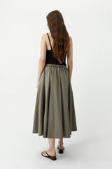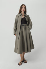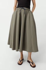 This skirt is designed with a mid-length circular shape and crafted from a light fabric. It features an elasticated waistband with a drawstring and contrasting cord and side pockets. The skirt’s weight adds elegant movement and volume to your look, with an elegant timeless vetiver color.