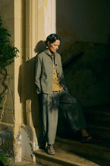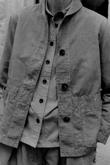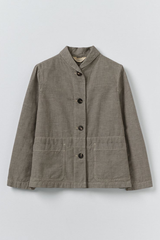 The Hal workwear jacket is made from an organic cotton and linen-blend woven into a micro houndstooth. Cut to a straight shape with a curved collar, then finished with patch pockets and garment-dyed.