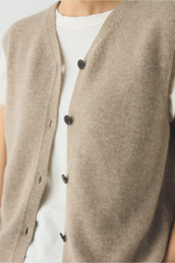 Wool and recycled cashmere blend. V-neck. Set-back shoulders. Ribbed hem. Corozo buttons.