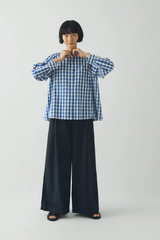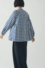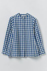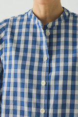 Gingham organic cotton. Panelled construction. Band collar. Swingy fit. Front placket. Corozo buttons.