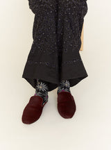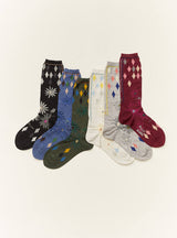 The Antipast AM-675A sock comes in four colourways with graphic diamond and flower motifs and a contrasting rectangle with text detail running up the back. They are mid-calf length with elasticated cuffs and printed branding, a fun addition to your everyday outfit.