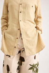 The Heritage Striped Shirt by Aleksandr Manamis is made from a soft linen viscose blend, the same fabric used in the lining of particular jackets this season. Featuring an elongated body that elevates layering, and buttons on the hem that allow for flexibility in styling. The shirt gives an effortless feeling, reminiscent of the most loved vintage shirts.