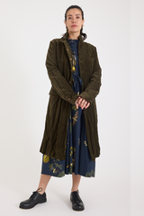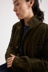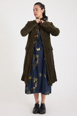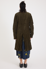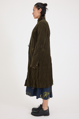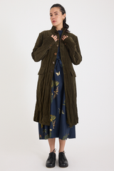 The Striped Velvet Coat by Aleksandr Manamis is crafted from a unique cotton-and-metal blend, giving the velvet a crinkled texture while ensuring durability. Designed with a high lapel, two external and internal pockets, and a full lining, it balances an effortless look with sophistication. Mismatched vintage buttons add a distinctive finishing touch, reflecting Manamis’ signature aesthetic.