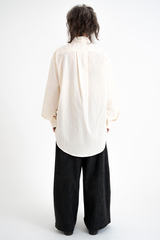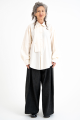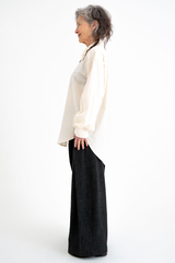 The Kassel trousers by Wright + Doyle are crafted from a fine stripe cotton. These trousers feature deep front pleats to create a sculptural silhouette. Finished with a raw edge waistband and belt loops, mounted on washed bone coloured Italian paper cotton. The pleated waistband is designed to be simply adjusted, and has been visibly stitched through so it can be easily adjusted by a tailor - as over time we often fluctuate through sizes.
