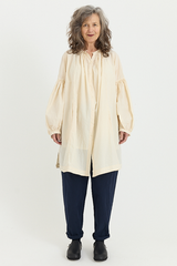 3 by 3 Shirt by Casey Casey in paper cotton with a subtle crinkle texture that softens with wear. Designed with a loose, relaxed fit, it features a round neckline, gathered sleeves, and buttoned cuffs for gentle shaping. Tone-on-tone corozo buttons run down the front, while side seam pockets offer practical detailing. The straight hem with side slits allows natural movement, creating an effortless, fluid silhouette that embodies Casey Casey’s understated, artisanal approach.