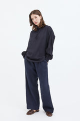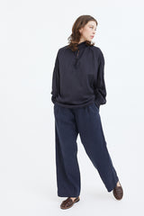 Classic linen drill pants with zip up fly and button closure, a flat waist band at front and elastic at back. Flattering pleated front detail and two patch pockets at the rear. Dyed by hand several times to achieve a beautiful richness of colour. Garments are then hand washed and rung, to give a soft and luxurious feel.