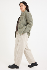 The P3 SL Jacket by Chez Vidalenc is crafted from 100% wool Harris Tweed. This distinctive piece features a mid-length silhouette, slim sleeves, two internal pockets, front patch pockets, and cotton-lined sleeves. It also features a stand, or notched collar, adding a special touch to its timeless design.