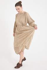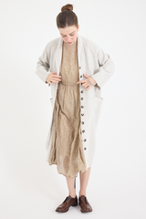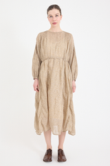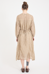 The June Dress in Ginza Print in Cotton Voile is a romantic style with fine pin tuck detailing and subtle gathering at the wrist. The hand screen print is inspired by a beautiful antique fabric found in a market in Japan. The print was faded in areas and this detail was carried over into the final design to capture the character, and patina of the vintage piece. The generous shape, drop shoulders, full sleeve with elasticated cuff and flat front ties allow the dress to flatter all different shapes and sizes.