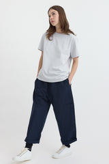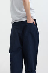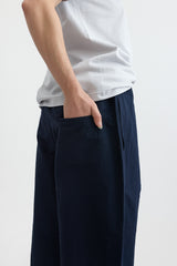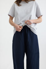 A loose fitting wide leg pant with a drop crotch. Crafted from a textured, lightweight linen-cotton blend, features include an elastic waistband with internal drawstring, side pockets, a welt pocket on the left leg, and a single pocket at the back.