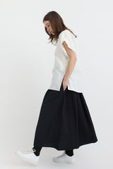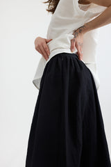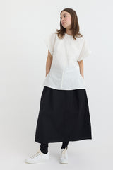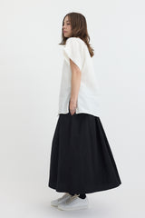 The Santiago is a full skirt with a grosgrain waist fashioned from a textural linen-cotton blend. Features an invisible side zip with hook & eye closure and a flat front with small pleat rouching through the side and back waist. This creates a flattering, full shape with deep side pockets.