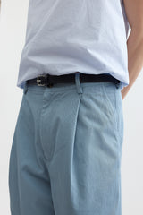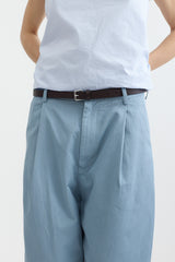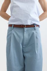 A slim belt fashioned from smooth leather. Square silver metal buckle with rounded edges and a fixed loop.