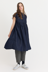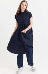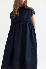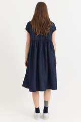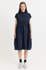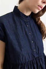 The P1865 Dress by Apuntob in Indigo is crafted from a lightweight cotton-linen blend. It features a petite stand collar, partial front button closure to the waist, a softly gathered high waistline, and a mid-length silhouette. Unlined.