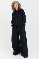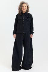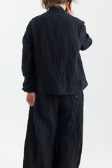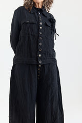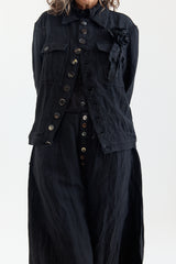 The Worker Jacket by Archivio J.M. Ribot is crafted from a midweight cotton-linen blend. It features a front fastening with a distinctive mix of aged buttons, two chest flap pockets, and a removable floral brooch. With a boxy silhouette and buttonholes accented by loose threads, this piece is rich in subtle, expressive details that reflect the brand’s dramatic and poetic identity.