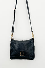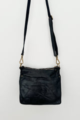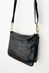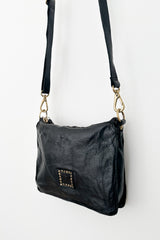 A cross-body bag made of fine natural cowhide leather, garment-dyed to guarantee durability. Features include a magnetic snap front pocket and a roomy central interior with zip closure. The interior is lined and includes a zip side pocket. Includes an adjustable, removable shoulder strap with distressed gold hardware.