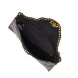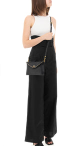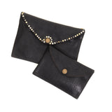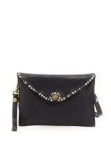 The Double Pochette is a great evening bag with a wrist strap and stud embellishment details. Featuring a main pocket and smaller rear detachable pocket with flap and stud closure and a detachable longer crossbody strap.