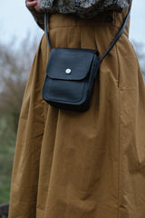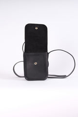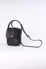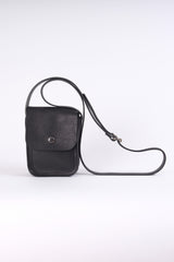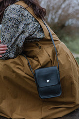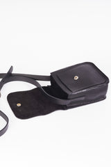 This sweet bag may look small but you would be surprised what you can fit in it... sunglasses, your phone, keys and other essentials. Made in England from black tumbled Italian vegetable tanned leather, it features a popper closure and has an adjustable buckle strap.