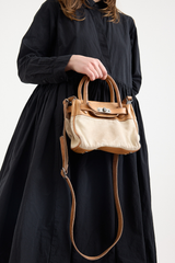 Small bag handcrafted in Italy by artisans of leather. Features an adjustable long strap with sides attachment, a central front buckle closure, and an interior pocket. The hand-dyed leather gives it a unique, artisanal look. The leather and fabric have a distressed appearance, adding a vintage charm to the products.