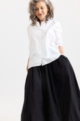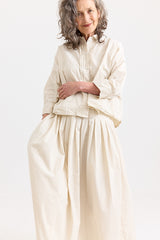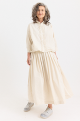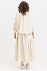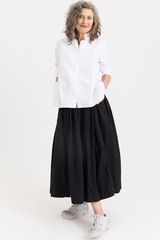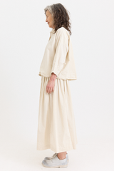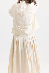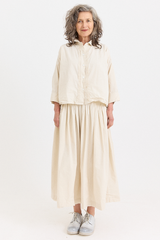 The Farmer Skirt by Bergfabel is crafted from lightweight, crisp cotton. It features box pleat detailing, an elasticated waistband with an internal adjustable drawstring, inset front seams, side pockets, and a midi length. Unlined. A contemporary and versatile piece for everyday ease.