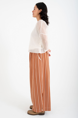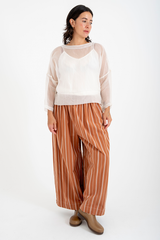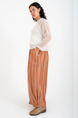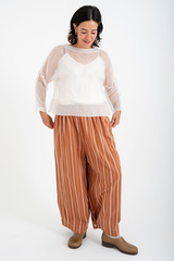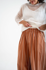 The Rosemary Pant from Bukeshla is crafted from a unique blend of linen, cotton and tencel. It features an elastic waistband, side pockets, and wide legs with a single button at the hem to adjust the width. The waistband and pockets are detailed with contrasting color finishes. This relaxed-fit piece exemplifies versatility and comfort.