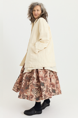 The Soleil Jacket by Casey Casey in natural linen-blend satin twill. Features a collar with button front fastening and long sleeves. A-line hem drapes softly, enhanced with slant welt pockets at the sides for practical detailing. Relaxed fit with cotton lining for comfort. The washed finish gives the jacket a subtle lived-in texture, highlighting the natural drape of the linen blend and the understated elegance of the silhouette.
