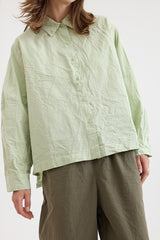 A classic Casey Casey crinkled paper cotton shirt. Features include a point collar, long sleeves and corozo buttons. Finished with twin side vents and additional length in the rear hemline. Slightly cropped in length and boxy in shape.