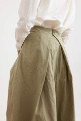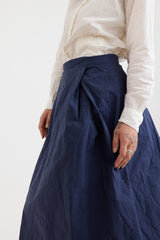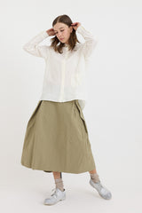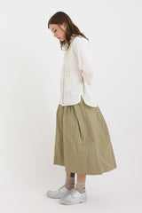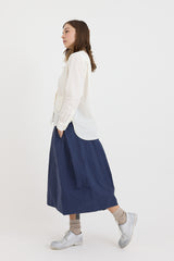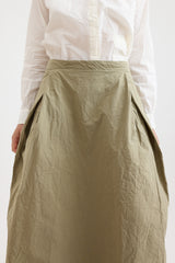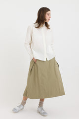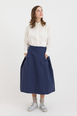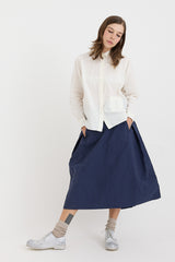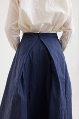A pleated A-line skirt in a structured washed cotton. Features a fixed waist with back zip/button closure. Front pleats conceal welt pockets, while the back pleat creates volume. Lightly rounded rear hemline with additional length. Fully lined.