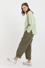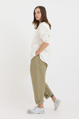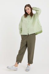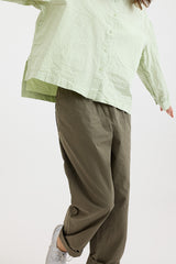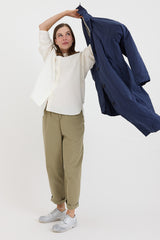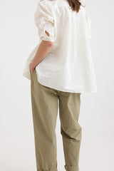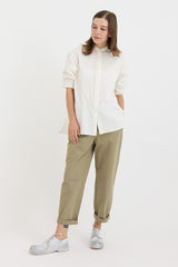 Bella is 170cm tall, wears an AU 8 and is wearing Size S here, paired with the Elena Shirt (Olive), the Moe Shirt (Sesame) and Marsell Zucca Media Derby in White-Grey.