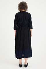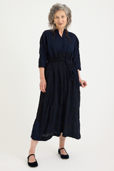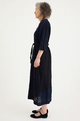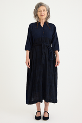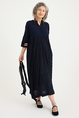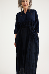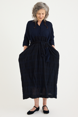 The PTC Di Lavato Dress by Daniela Gregis is crafted from 100% wool, in an incredibly beautiful navy and blue weave, with variations in colour and pattern on each panel. The dress features a maxi-length design, a collar, and 2 sleek side pockets. With a singular button at the collar, it can be worn open or high neck. A standout detail is the adjustable waist, designed to be cinched using the scarf detailing. The nature of this one-size design is intended to fit most sizes, offering versatility with the included scarf enabling the dress to be worn loose and boxy or cinched and formfitting.