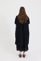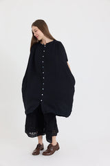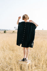 The Kaia is a simple oversized button-through dress featuring soft gathered details along the shoulder and back yoke, an elegant mandarin collar and generously cut half sleeves complete the look. The Kaia can be worn as is, open as a jacket or as a tunic, layered over pants.