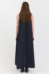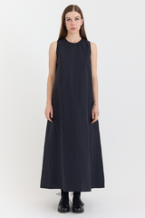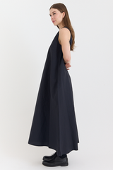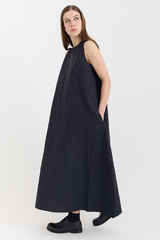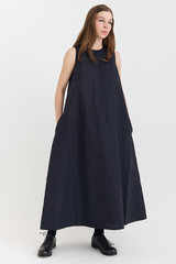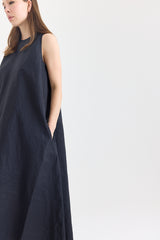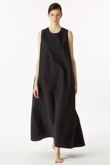 A sleeveless dress by Sofie D’Hoore, crafted in glazed cotton. Designed with a round neckline at the front and a softly scooped back, side seam pockets, an A-line silhouette, and a mid-calf length. Quietly refined and beautifully considered.
