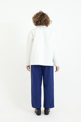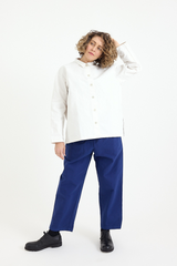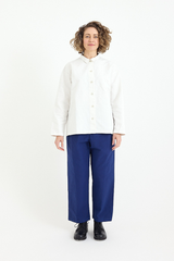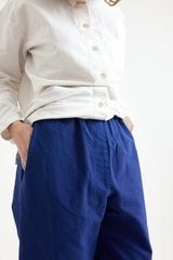 The Boyfriend Yizic pants feature an elastic waistband, mid-weight cotton paper fabric, side pockets, and patch pockets at the back. The relaxed fit tapers slightly at the ankle. Avoid ironing to preserve the naturally wrinkled features fabric.