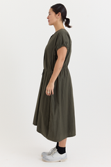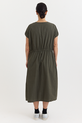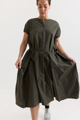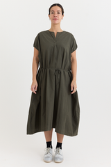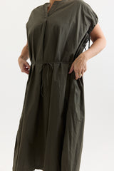The Frou Frou Tank Dress by Manuelle Guibal is crafted from lightweight cotton with a beautifully soft crinkled texture. It features a round neckline with a front slit and pleat detail, extended shoulders with drawstrings at the armholes, side seam pockets, and a drawstring waist for adjustable shape.
