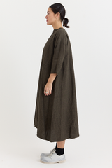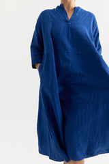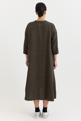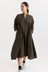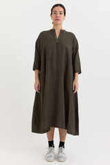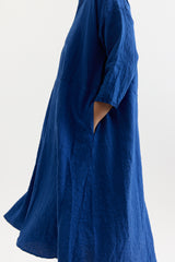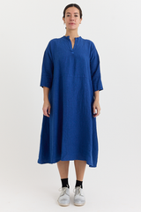 The Yilin Mao Dress by Manuelle Guibal is crafted from midweight linen with a softly crinkled texture that adds movement and character. Designed with a stand collar and front placket, this style features a trapeze silhouette with a high waist seam, side seam pockets, and elbow-length sleeves.