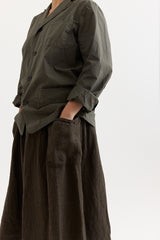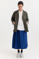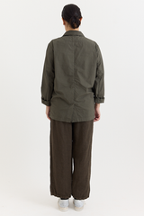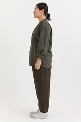 The Iyo Jacket by Manuelle Guibal is crafted from lightweight cotton with a soft texture and relaxed drape. It features a collared neckline, front button fastening, long sleeves, two large patch pockets, a smaller chest pocket, and a back vent. A versatile piece that can be worn as a shirt or layered over tops, perfect for effortless everyday styling.