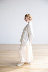 A long floaty skirt with a hem pleat, flat waistband at the front, elastic waist at the back and pockets. This skirt is made from a lightweight linen so it's light and floaty to wear.