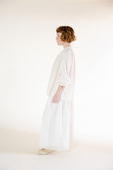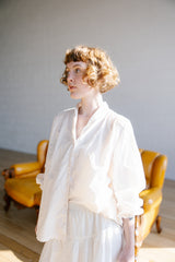 Introducing the Pearl Blouse - a feminine blouse inspired by nostalgia and crafted with a fresh cotton poplin. Featuring a romantic shawl collar and exquisite pleat detailing. Delicate shell buttons adorn the front, complemented by gentle gathering.
