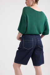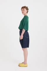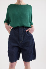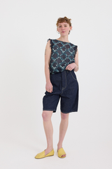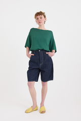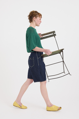 These balloon-fit shorts by Minä Perhonen are crafted from mid-weight cotton-linen denim. They feature a five-button closure with butterfly detailing (one visible), belt loops, and five pockets (including a small key/coin pocket). One of the back patch pockets is adorned with the brand’s signature tiny metal butterfly. With a high-waisted fit and a long rise, this contemporary piece elevates the everyday.